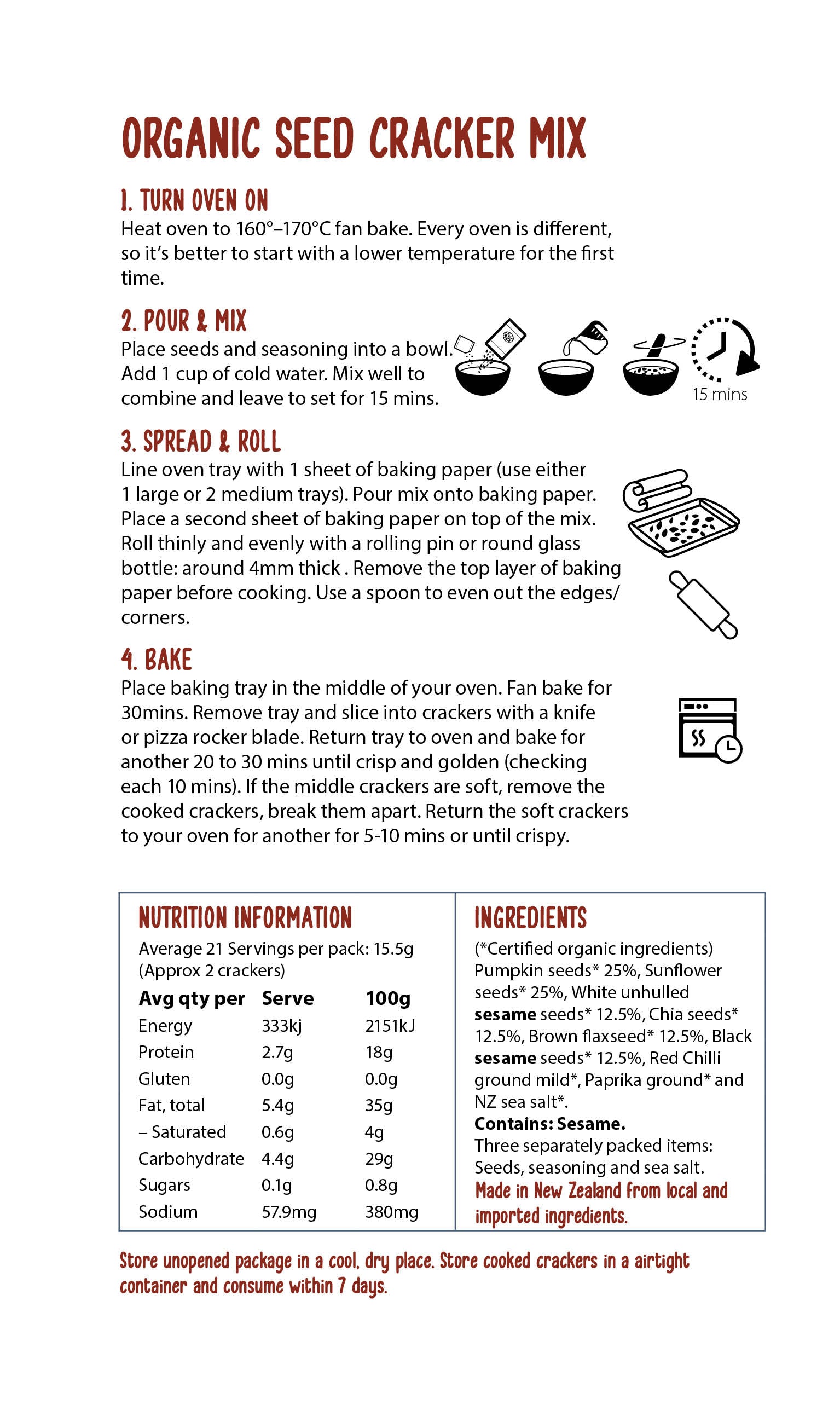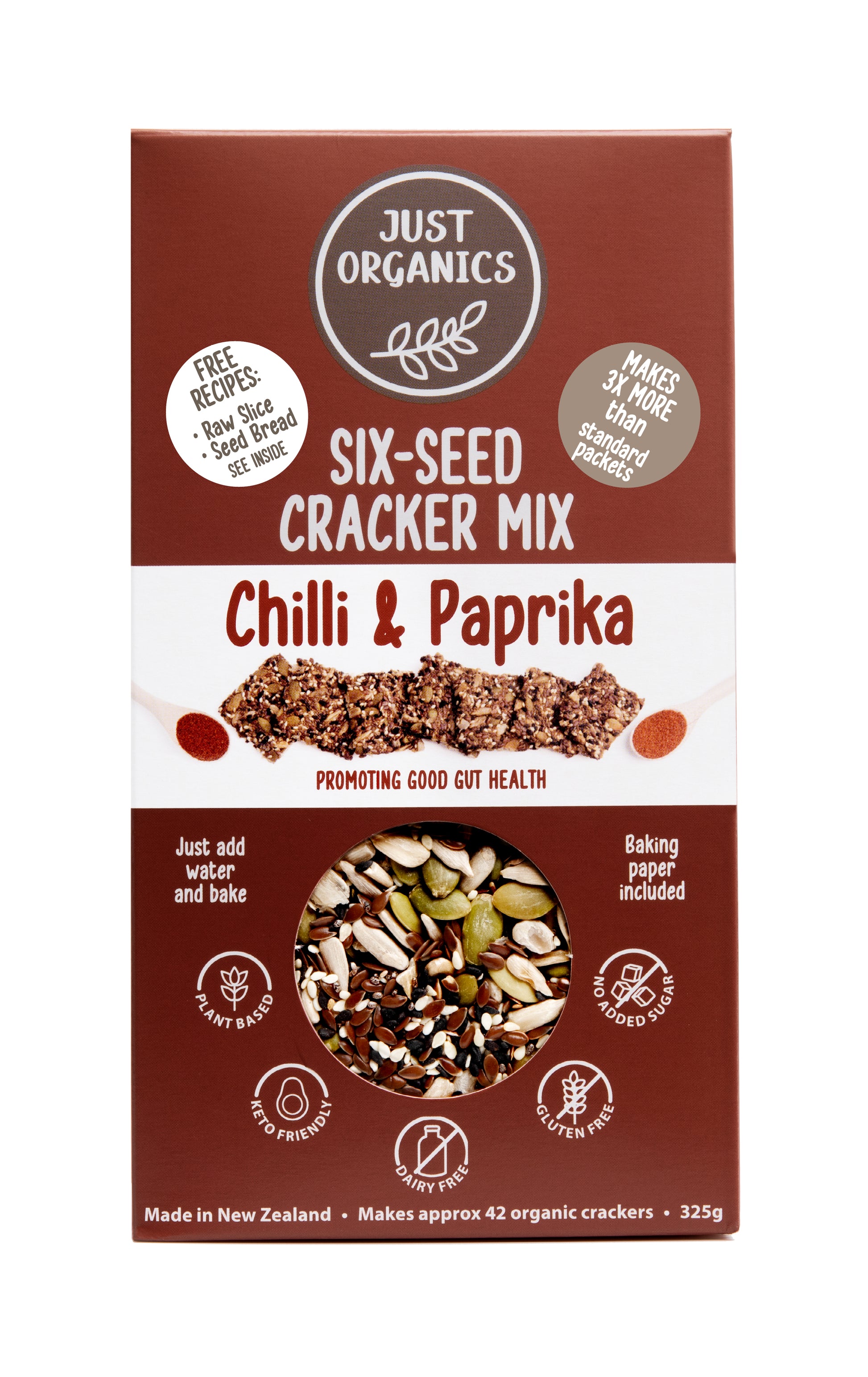 Seed crackers are a healthy and nutritious snack. Promoting good gut health with 100% organic seed cracker mixes. Easy to make, just add water and bake. We have even included baking paper. Just Organics is all about good food that equals good health. With the goodness of pumpkin, sunflower, brown flax, chia, white and black sesame seeds. A super food that is unbelievably versatile. Low carb and gluten free.
