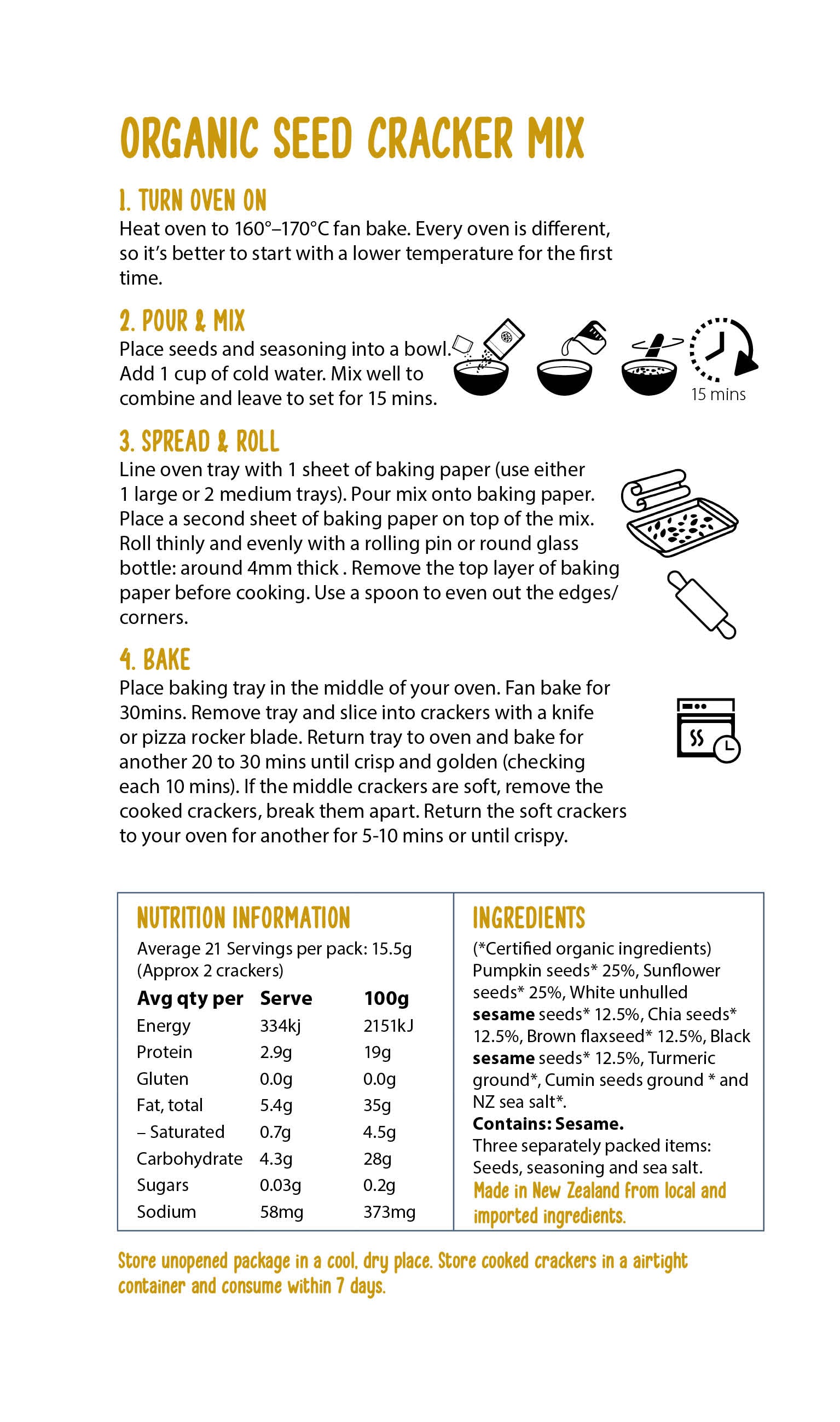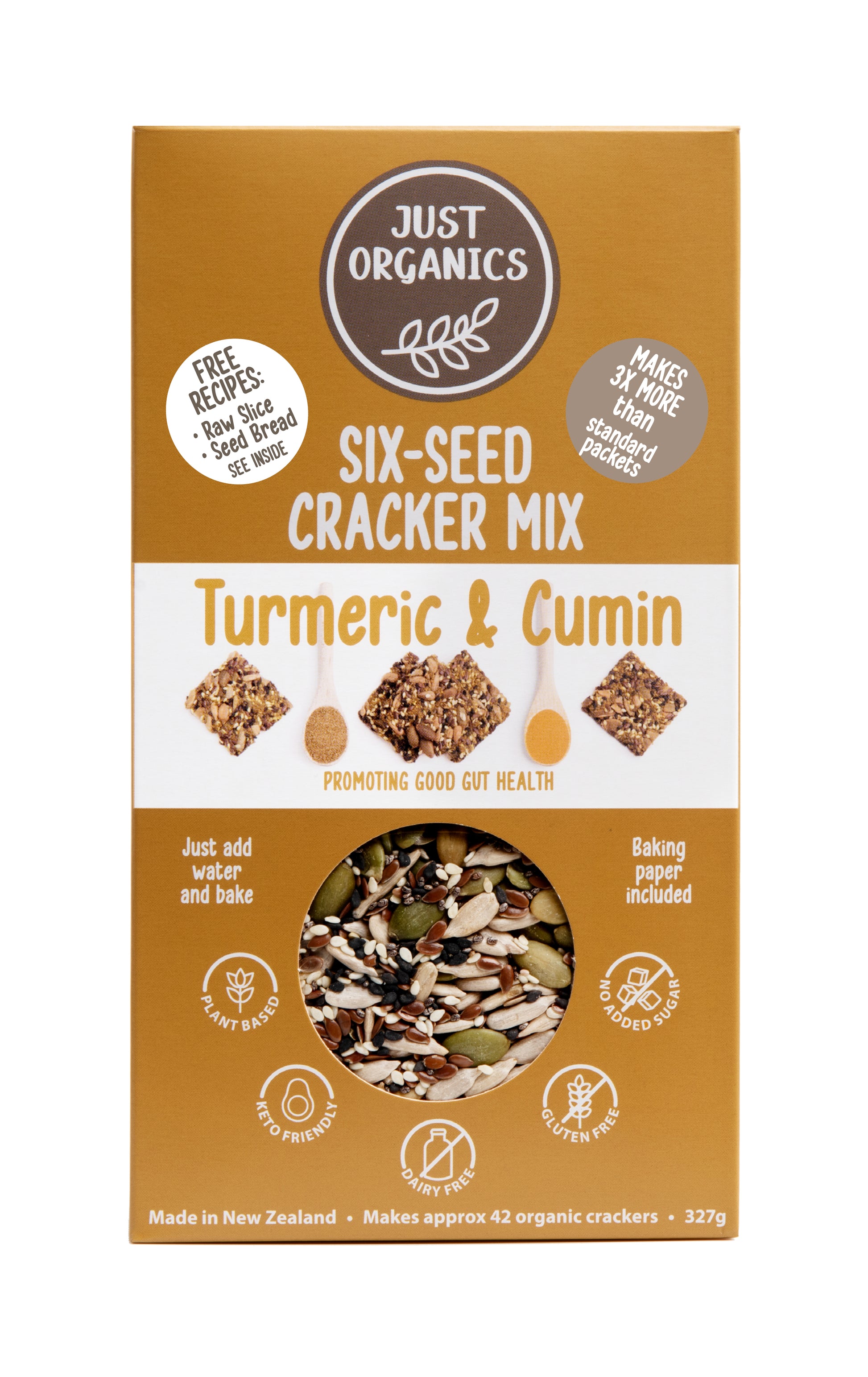 Seed crackers are a healthy and nutritious snack. Promoting good gut health with 100% organic seed cracker mixes. Easy to make, just add water and bake. We have even included baking paper. Just Organics is all about good food that equals good health. With the goodness of pumpkin, sunflower, brown flax, chia, white and black sesame seeds. A super food that is unbelievably versatile. Low carb and gluten free.